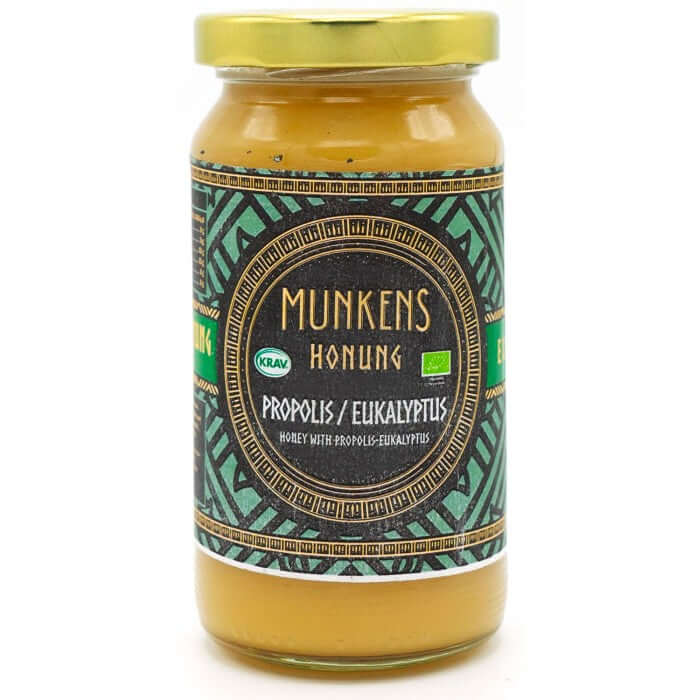 عسل سويدي عضوي من Munkens Hälsa - هنا ممزوج مع الأوكالبتوس والبروبوليس.