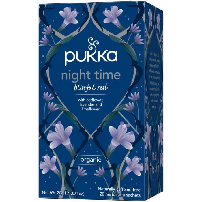 Pukka Night Time Tea es un té orgánico con un sabor dulce y rico de hierbas: raíz de valeriana, lavanda, manzanilla y raíz de regaliz.