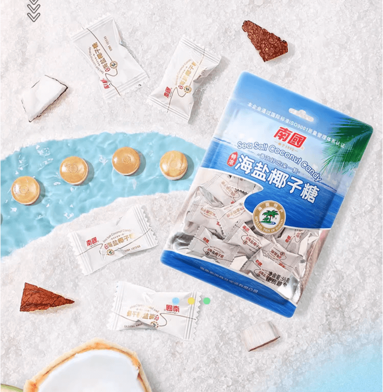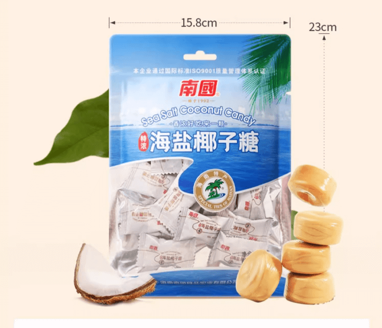 Caramelo duro de coco, sin grasas saturadas, sin colesterol, hecho con jugo de coco, sin colorantes artificiales.